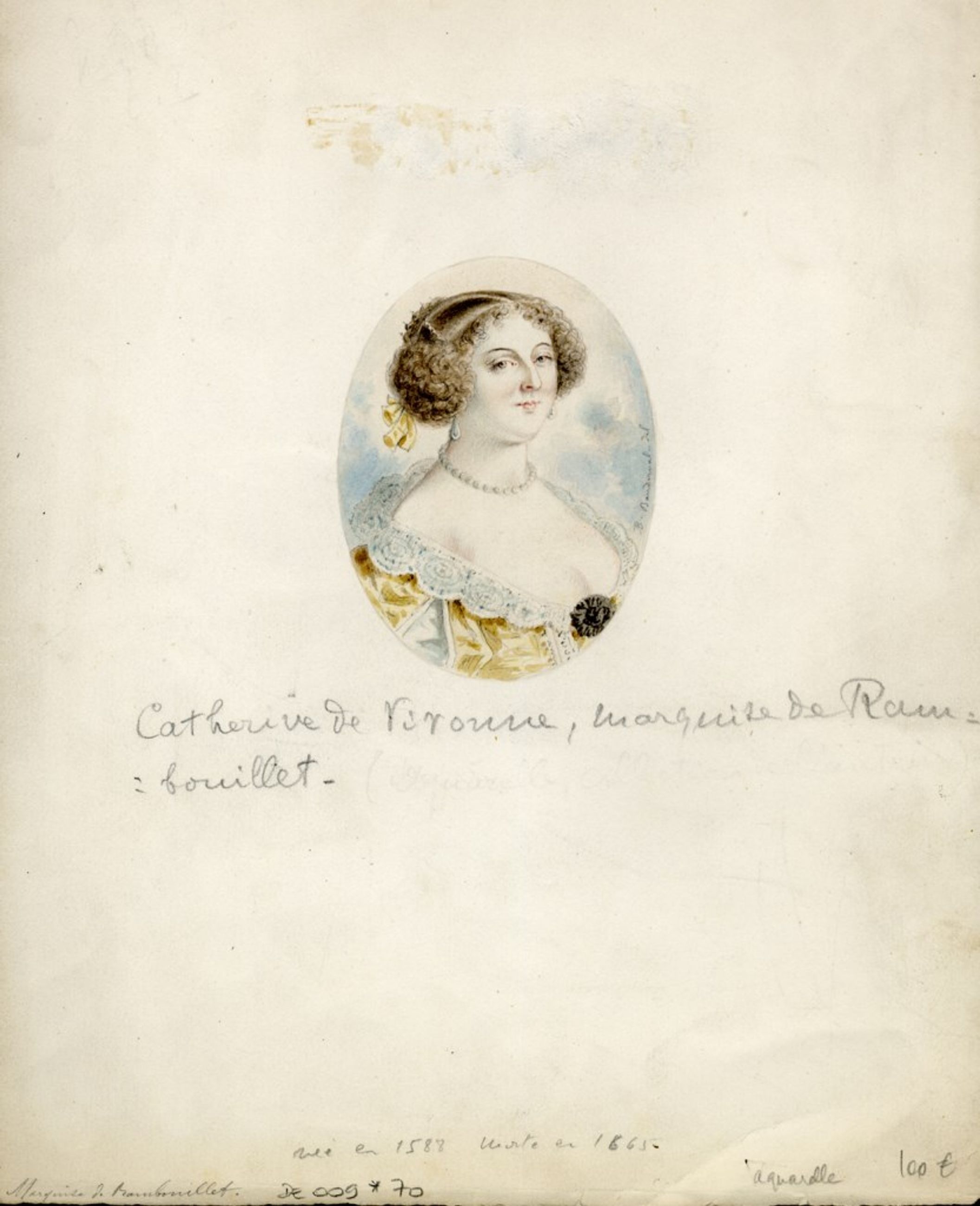 Dessin à l'aquarelle représentant la marquise de Rambouillet dans un médaillon. Elle est de trois quart droit. La marquise porte une parure de perles ainsi qu'une robe jaune avec un col en dentelle. Ses cheveux bouclés sont rassemblés sur les côtés de sa tête ainsi que derrière, laissant apercevoir un ruban jaune.
