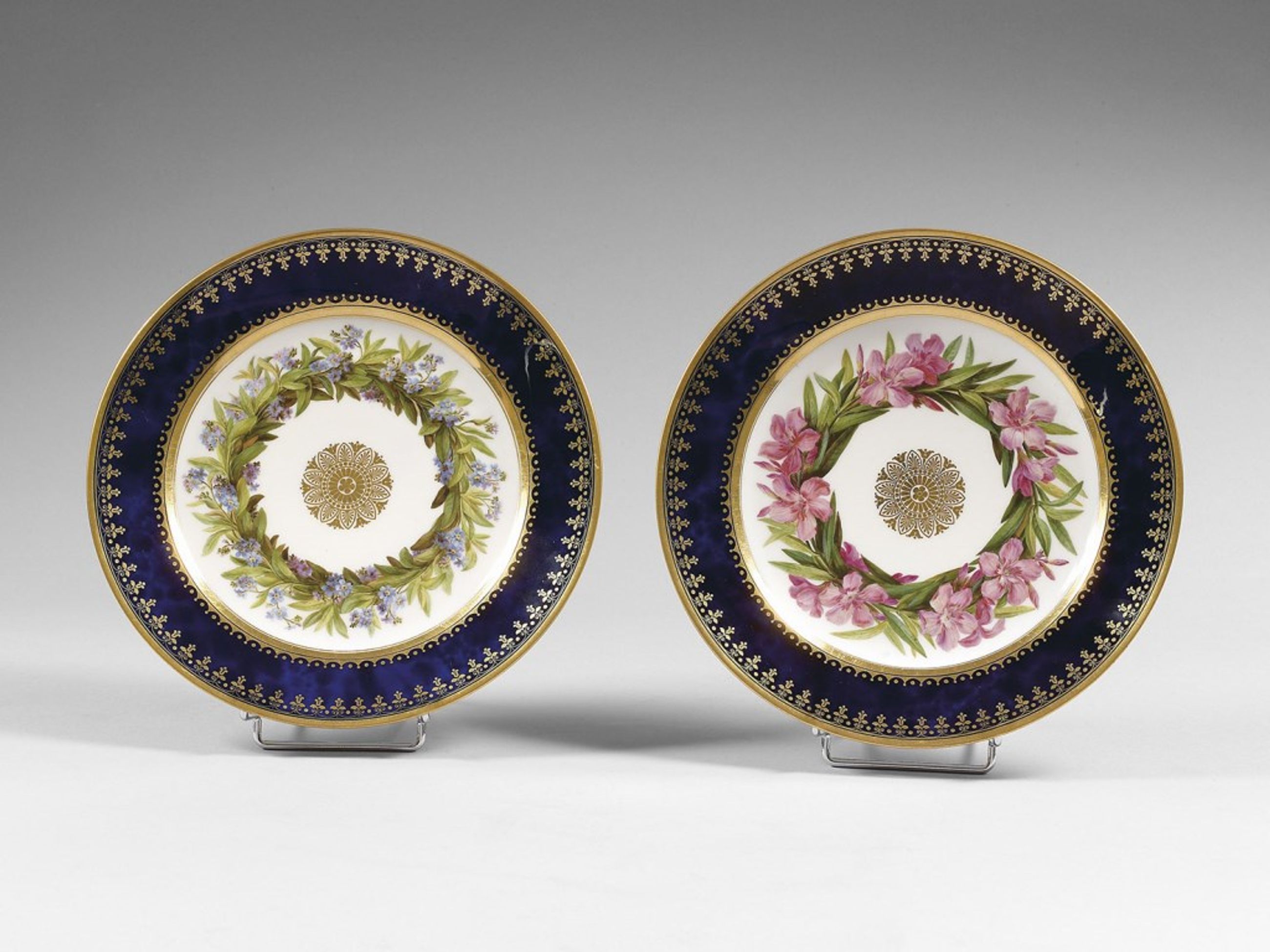Assiette d'une paire provenant du service commandé par Charles X pour Chateaubriand ambassadeur à Rome. Le bord est bleu lapis, orné de motifs en frise et de filets d'or avec un décor polychrome sur l'aile et une couronne de myosotis (Scorpione des marais). Au centre se trouve une rosace or.